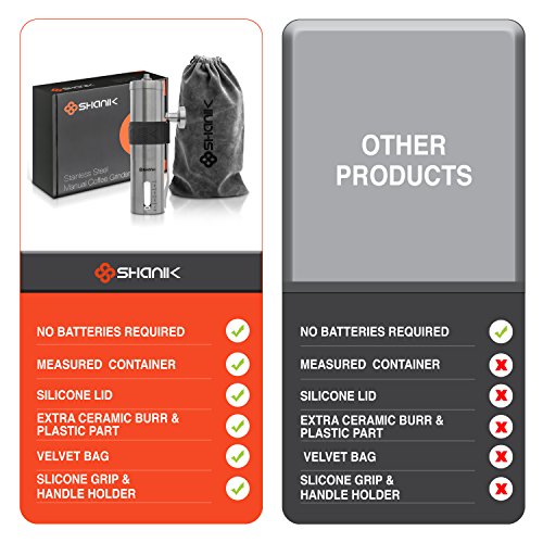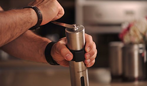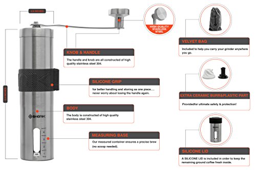 - HIGH QUALITY STAINLESS STEEL: Our coffee grinder is built to last. The body, handle and knob are all constructed of high quality stainless steel 304 and it has a durable ceramic burr. An EXTRA CERAMIC BURR is also provided for ultimate safety & protection! Get it now and keep it for a lifetime!