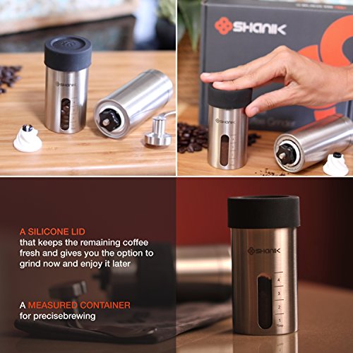 Premium Quality Stainless Steel Manual Coffee Grinder - Portable Burr Coffee Grinder - Conical Ceramic Burr for Precision Brewing - Silicone Lid to Keep Coffee in Container - Lightweight Grinding
