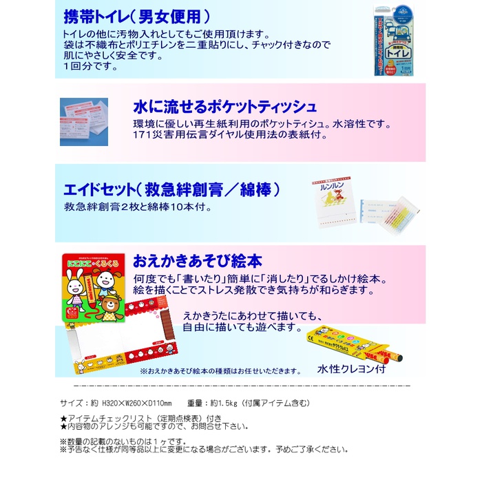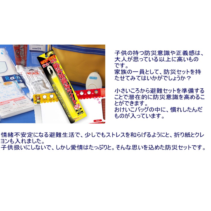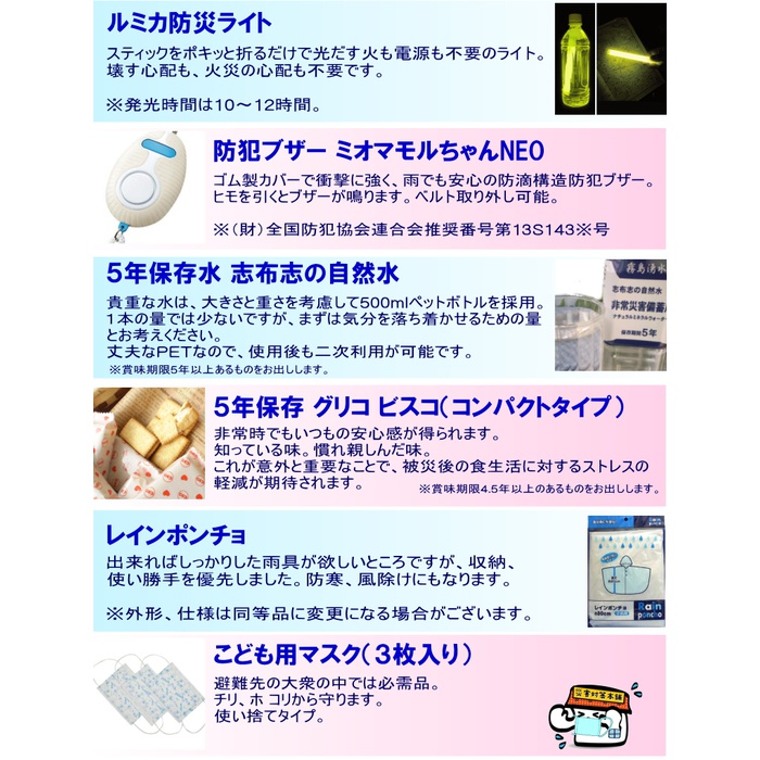 어렸을로부터 피난 세트를 준비 하는 것으로 잠재적으로 방재 의식이 높여집니다.통원가방 안에,평상시 사용부터 외출로도 쓸만한 것을 끼었 내용(11점 세트+약간 선물)가 되고 있습니다.