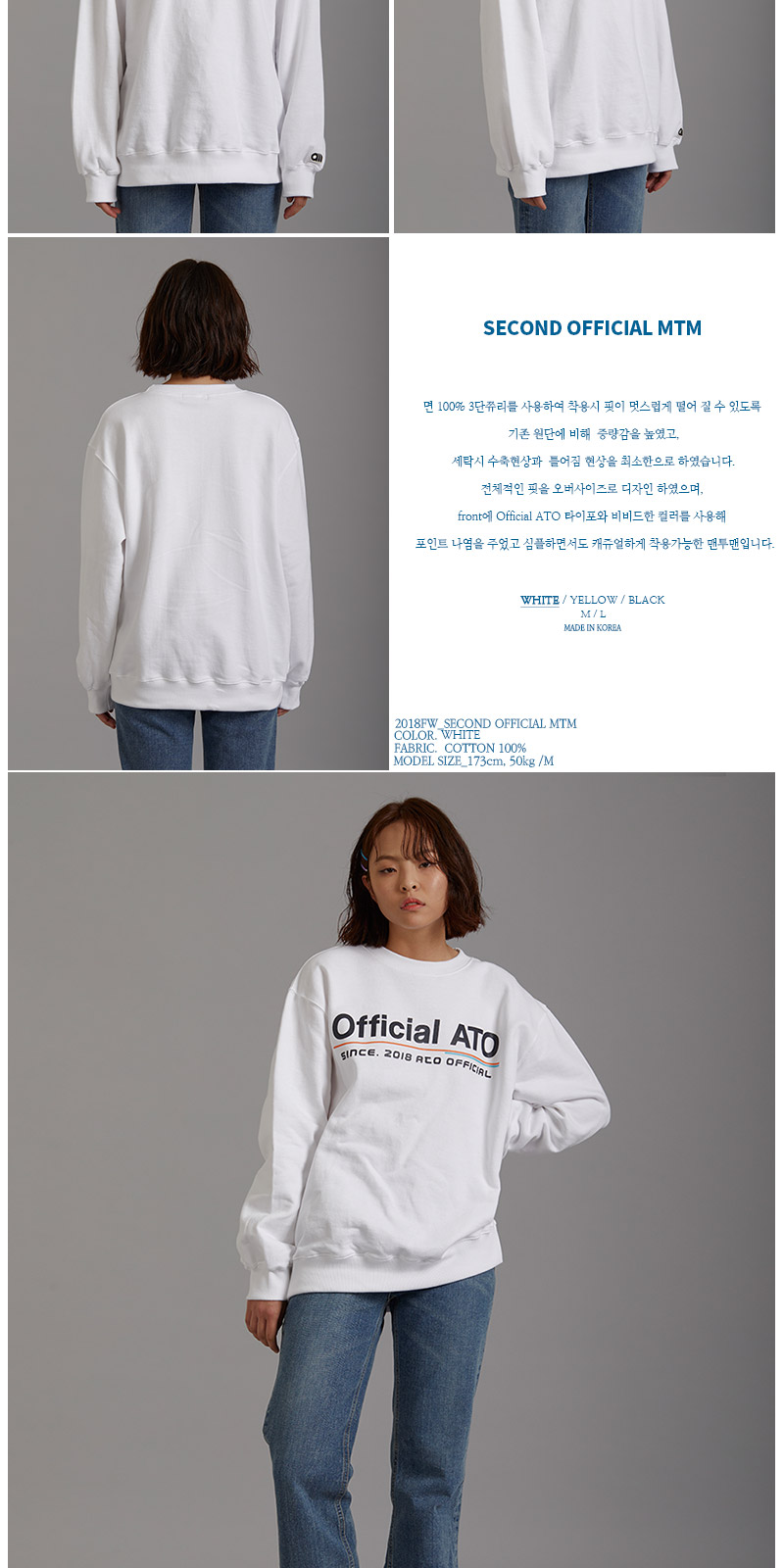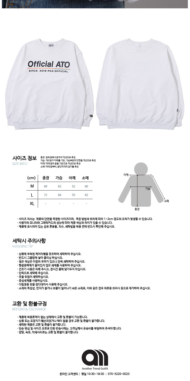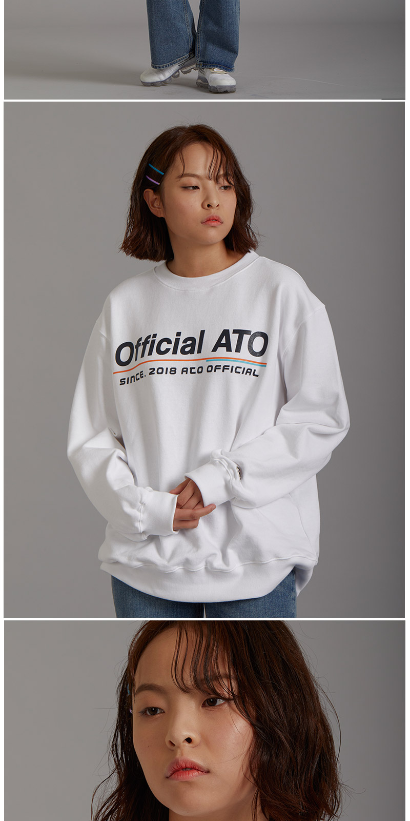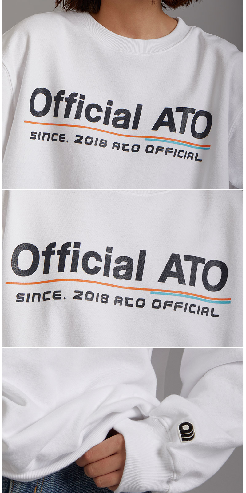 전체적인 핏을 오버사이즈로 디자인 하였으며, front에 Official ATO 타이포와 비비드한 컬러를 사용해 포인트 나염을 주었고 심플하면서도 캐쥬얼하게 착용가능한 맨투맨입니다.