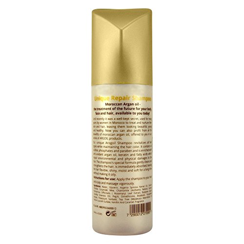 Studio : ARGOIL Publisher : ARGOIL Binding : Health and Beauty Product Description ARGOIL Unique Repair Shampoo is enriched with Moroccan Oil, Anti-oxidants, Keratin and fatty acids which repair environmental and physical damages to the hair. It contains no sulfate, phosphates and paraben. ARGOIL Shampoo revitalizes all hair types while maintaining the hair color. The shampoo's special formula gently cleans and strengthens the hair, is immediately absorbed, leaving the hair flexible, shiny, moist and soft for a long time without making it oily. Made in Israel: ARGOIL Unique Repair Shampoo as well as the other ARGOIL products are all made and imported from Israel. Not tested on animals. 0