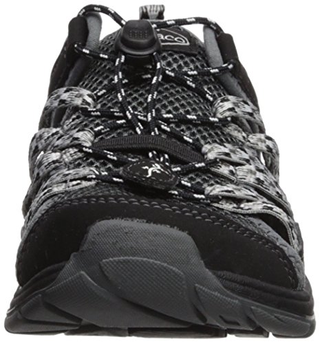 -. Feature : Mesh-lined upper with protective synthetic toe cap / Lace keeper and webbing pull tabs for easy on/off / Cord lacing with injection-molded plastic quick lock / Durable luvseat pu footbed with antimicrobial application for odor control / Non-marking ecotread 25% recycled rubber outsole with 2mm lug depth and siped "z' lugs