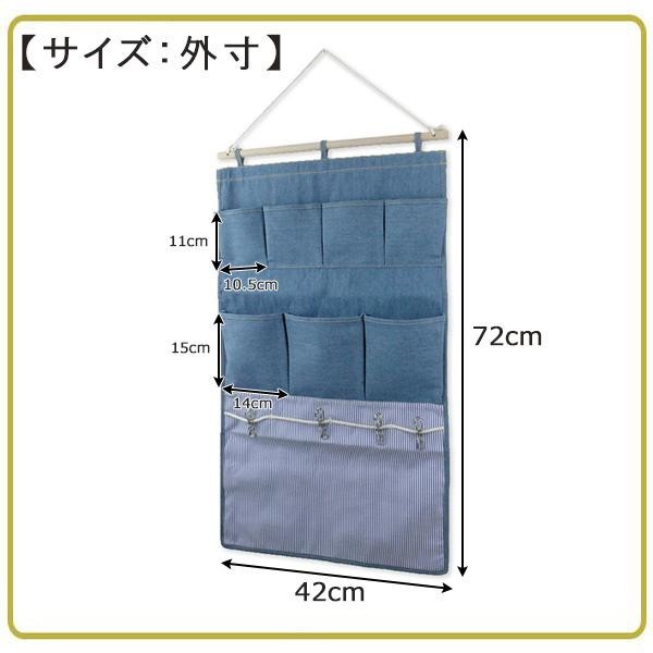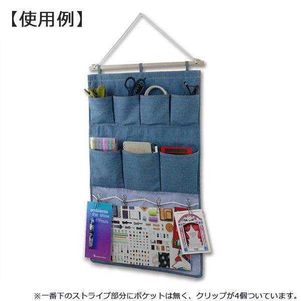 | 7個のポケットにはハサミやペンなど、4個のクリップにはハガキや写真、メモなどを飾ったり、挟んだりできます。 デニム素材とストライプ柄が、どんなお部屋にも合いやすいです。 |