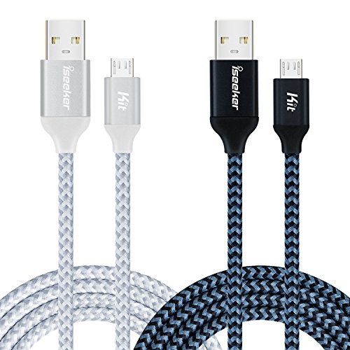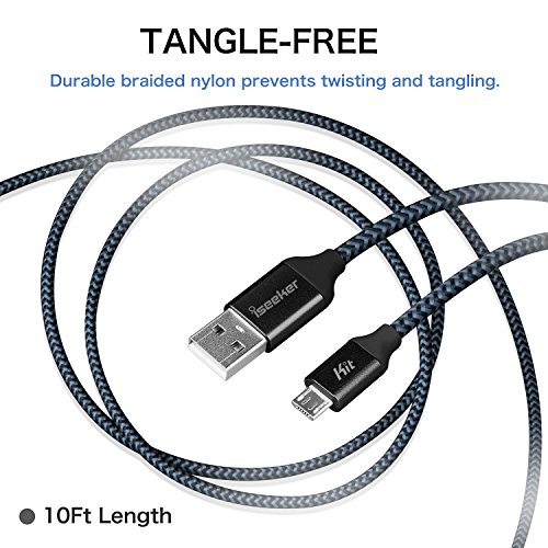 USB Charging Cords, iSeekerKit 2 Pack 10Ft High Charging Speed USB 2.0 A Male to Micro Nylon Braided USB Cable with Aluminum Connector for Samsung, Android and more(Black&Silver)