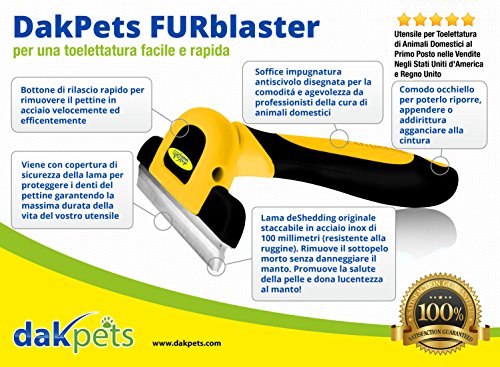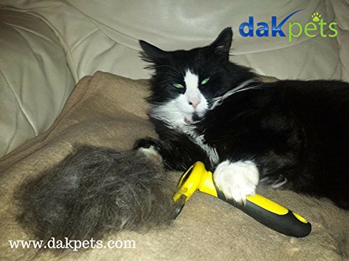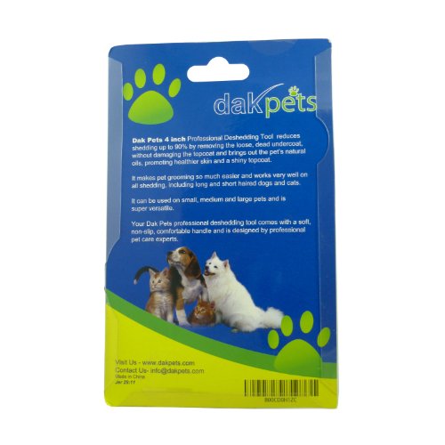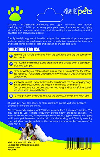 Here's A Quick, Easy, Clean Way to Remove the Loose, Dead Undercoat, while Gaining A Shiny Top Coat, IN A MATTER OF MINUTES- GUARANTEED! Sick Tired of your pet dropping hair ALL over the house in the car? Fact is- dogs cats shed ALOT; So, if you are looking for a sure fire way to reduce shedding by up to 90%, without damaging the topcoat, whilst promoting healthier skin a shiny top coat then this may be the most important page you've read today. Our deshedding tool will dramatically reduce shedding after just one 15 minute session. It is developed by Pet Care EXPERTS who specialize in dog cat grooming tools. Best of all... use it on- short long hair dogs cats; both small large.Our materials protect you your pets from skin allergies. DakPets Features: 1. STRONG, soft, durable handle that won't break 2. Non irritation 100mm stainless replacement comb, with SAFE BLADE cover 3. Use it as a stand-alone grooming tool to remove matting knots. Very Versatile Here's what you get when you buy a DakPets Deshedding Tool:- - 1 deshedding tool with a 100mm stainless comb