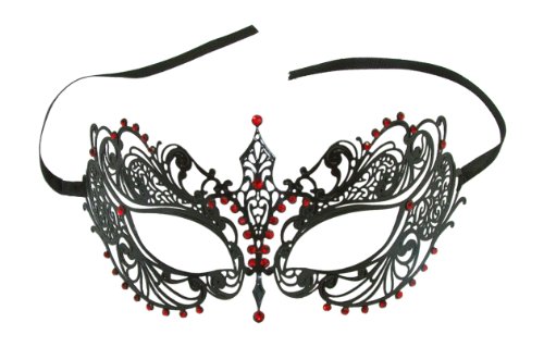 -. Feature : Elegantly Designed Venetian Metal Laser Cut Masquerade Party Mask / Eco-Friendly Lightweight Material Used / One Size Fit All / Color: Black with Red Rhinestones