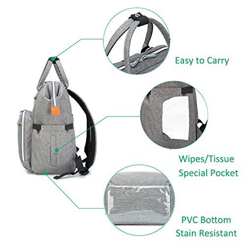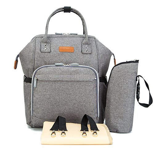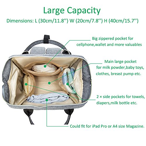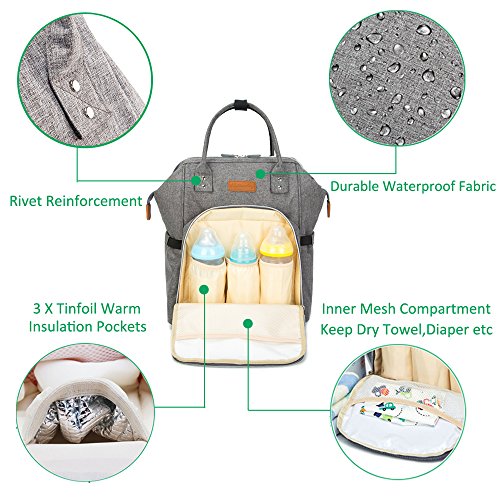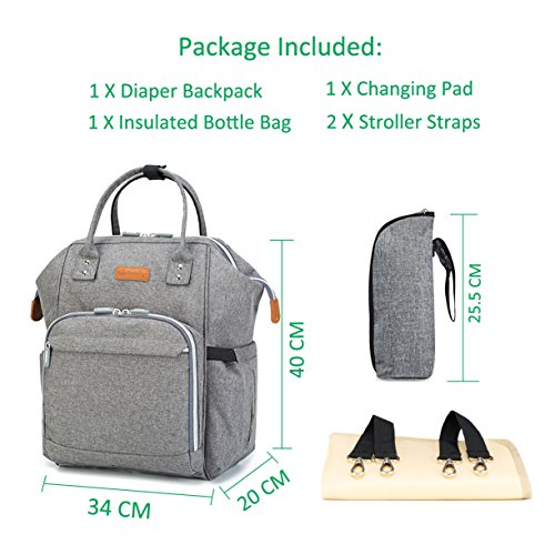 Studio : Lacheln Publisher : Lacheln Binding : Baby Product Product Description Smart Organized Pocket Design 3 tin foil insulation layer milk bottle holders in the front which can keep warm or cold for hours. (The bottle pocket size could fit for Dr Brown milk bottle 150ml or 270ml.) The left side pocket could put wipes/tissue. The right side pocket could put water bottle or umbrella etc. Main pocket for baby's clothes/shoes,milk powder,food,toys. Four inner pockets: One zippered compartment for cellphone,wallet and valuables. 2 side pockets for milk bottles,towel,pacifiers and diaper. One large compartment for tablet PC like iPad Pro or A4 size magazines. One invisible zippered anti-thief pocket on the back keeps your valuables from being stolen. Free your hands --Multi-function design As a backpack,the thick padded shoulder straps bring you a comfortable carry. As a handbag,the top handle design make this bag easy to tote.The handle part all use the rivet to reinforce,solid and durable. Two stroller straps make it to carry on the stroller more convenience. Hang it on the luggage or trolley case by the back strap design. Package included: 1 X Diaper Bag 1 X Changing Pad 1 X Insulated Bottle Bag 2 X Stroller Straps 0