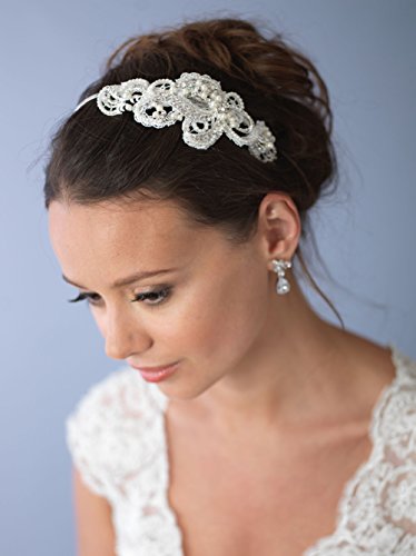 The luxury of dainty ivory pearls and the brilliance of fiery rhinestones meet in this asymmetrical bridal headband featuring just the right amount of feminine charm. The drama of the pearl beading and gems contrasts beautifully with pure white lace that embraces the whole of the embellished portion of the band. Photographs don't - can't, really - do it justice because the detailing is simply too exquisite for a lens to capture in full. Measuring 15" from pin loop to pin loop and over 2" at its widest point, this is the kind of bridal hair accessory that can make wedding guests forget about the dress.Feature