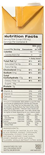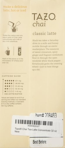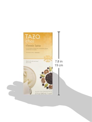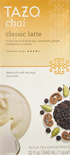 -. Binding : Misc. -. Brand : TAZO -. EAN : 0794522703005 -. Feature : A 32-oz bottle of concentrated black tea and exotic spices to blend with milk or water. Serve hot or over ice. / Tasting Notes: Rich, malty, caramel, spicy. / Enjoy this with: A cinnamon scone and a dreamy look in your eyes. / Directions: 1. Shake carton, mix equal parts of Chai Concentrate with milk; 2. Add heat (TAZO tea lattes are easily prepared via microwave, stove top or open fire pit); 3. Enjoy! -. IsAdultProduct : 0 -. Label : TAZO -. LegalDisclaimer : Please check the ingredients before use. We recommend that you do not rely solely on the information presented and that you always read labels, warnings, and directions before using or consuming a product. -. Manufacturer : TAZO -. Model : 79452270300 -. MPN : 011017406 -. NumberOfItems : 1 -. PackageQuantity : 1 -. PartNumber : 011017406 -. ProductGroup : Grocery -. ProductTypeName : GROCERY -. Publisher : TAZO -. Size : 32 oz -. Studio : TAZO -. Title : Tazo® Chai Tea Latte Concentrate 32 oz -. UPC : 794522703005