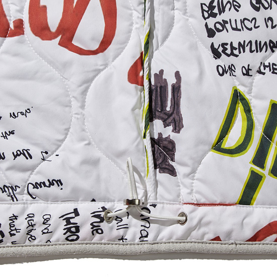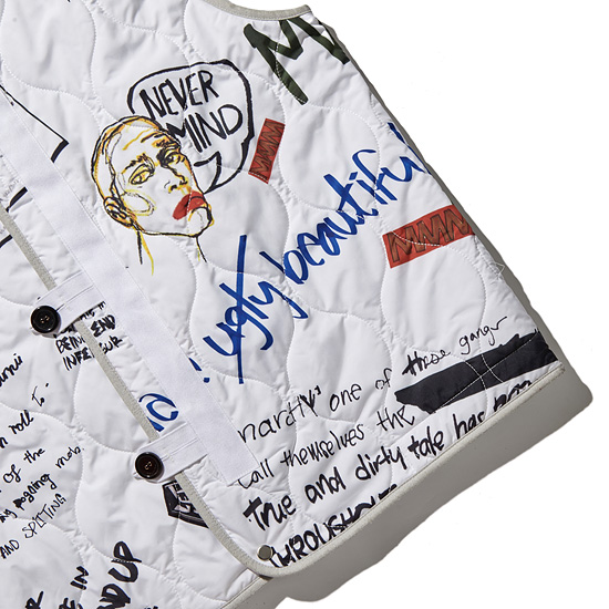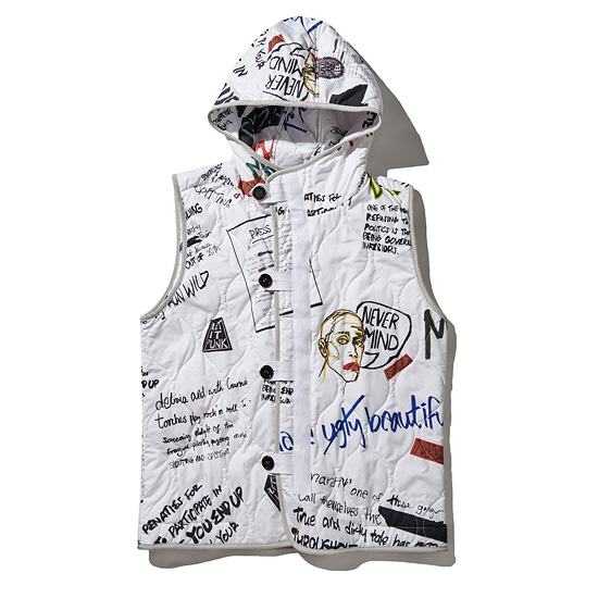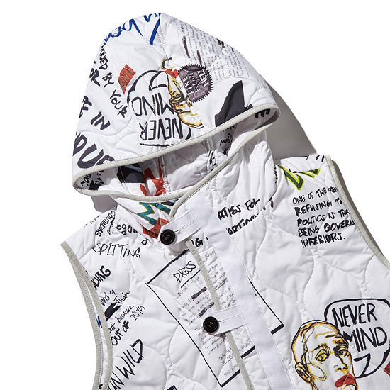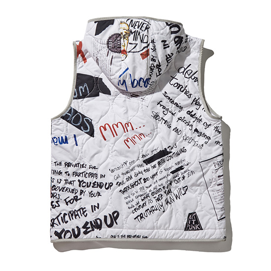 - 펑크에서 모티브를 얻은 그래픽 프린팅이 돋보이는 남성 후드 베스트.