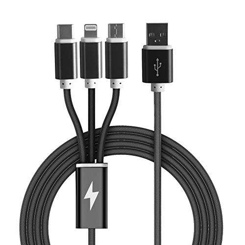 -. Feature : 3-in-1 Cable fast charging: 2.1A high-speed charging, It supports 2.1A charge to give your 3 devices more quickly charged at the same time.The up-to-date 3in1 design which charges most of the mobile phones available on market (Charging only, not for Sync Data). / Universal and Multi-functional: No need to carry any other cables when you are in a car, office or travelling.3 in 1 Cable is all in one portable charging solution for those who are on move all the time. / Nylon Braided & Aluminum Alloy Design: Makes the cable more durable, pull-resistant and elegant. the 108 stips 0.08mm bold high-quality tinned copper wire core will speeding up charging by 30%. / [Lightning] for iPhone 7/7plus 6s/6s plus/6/6 plus/se/5s/5c/5,iPad4, iPad Air, iPad mini,iPad pro and more.[Micro USB] for most Android phones,tablets,Bluetooth headset,external batteries,PS4/Xbox one controllers and more.[Type-C] for Samsung S8/S8+,Nexus 5X/6P,Lumia 950,Lumia 950 XL,Huawei P9/P9 Plus,OnePlus 2/3,Nokia N1,HTC 10 and more(not compatible with Macbook) / What you will get: 30-day full money back guarantee and 24 x 7 friendly customer services.