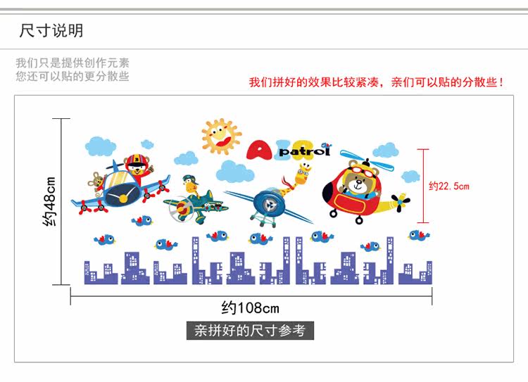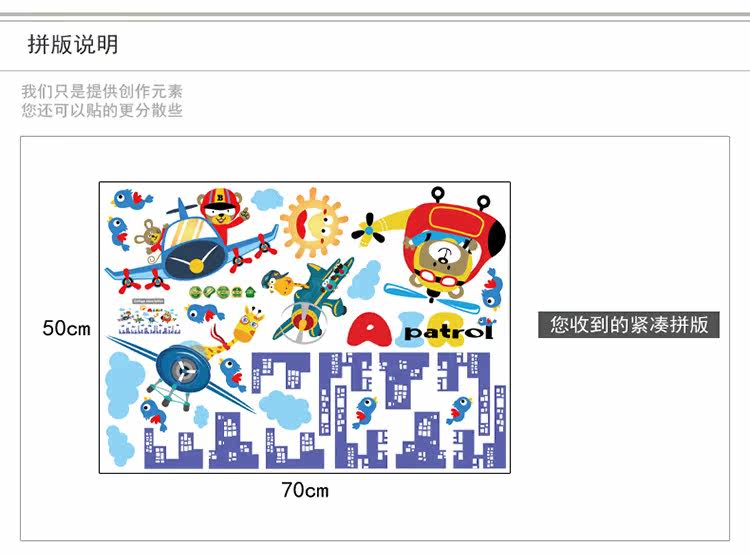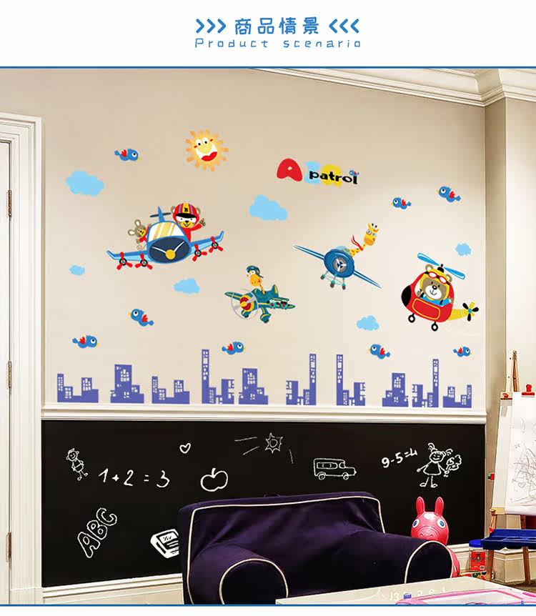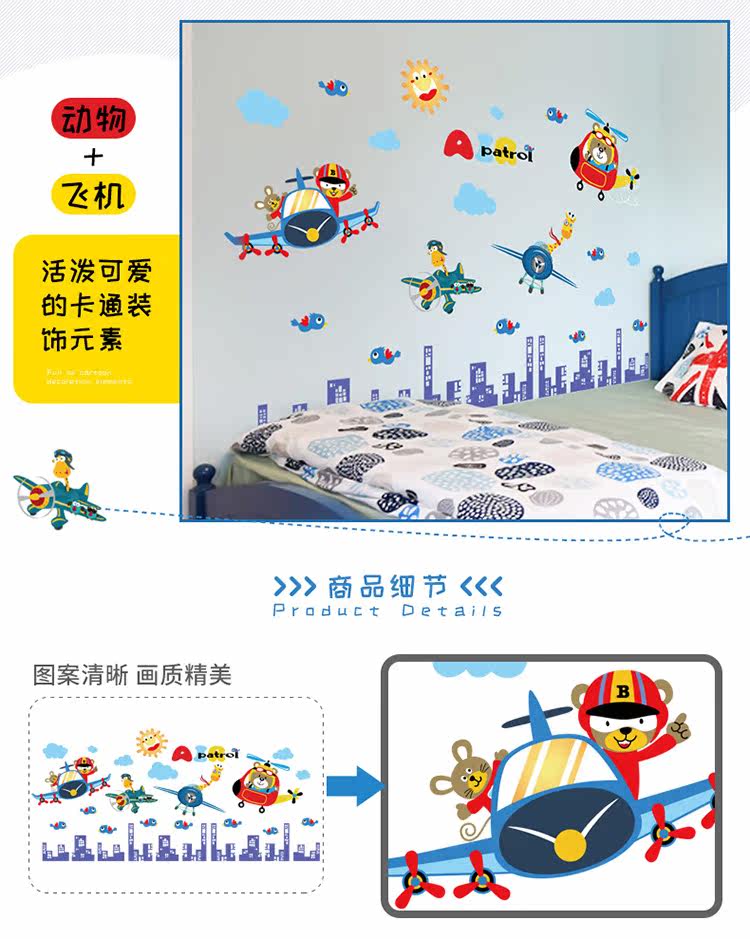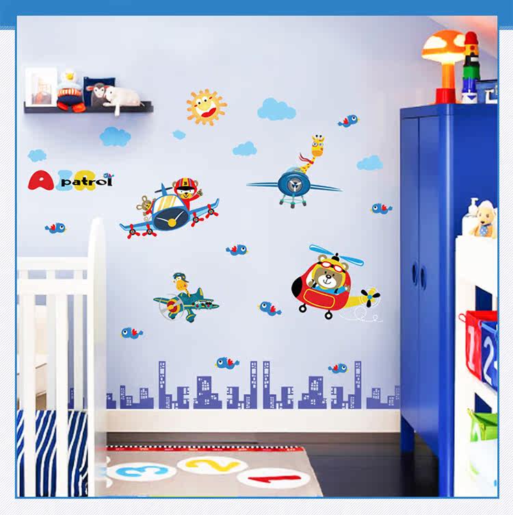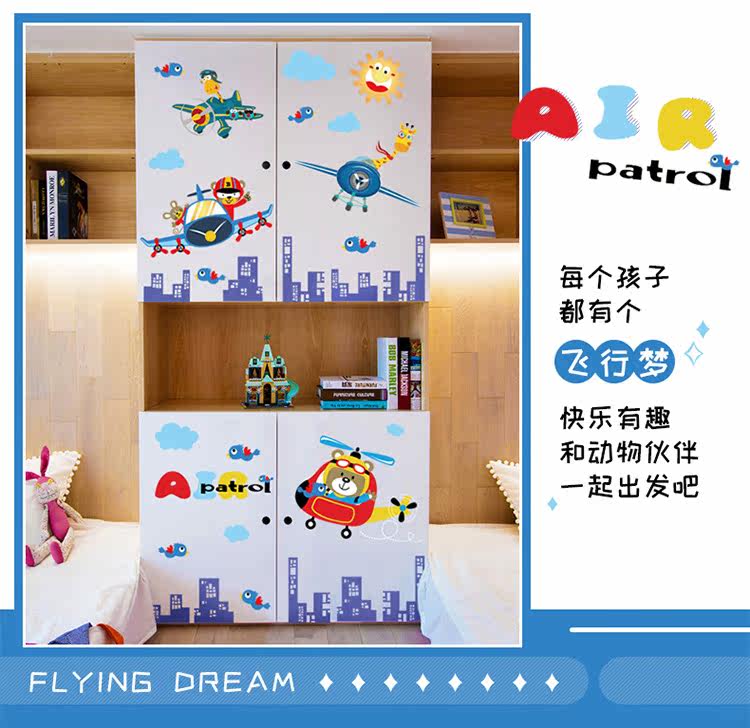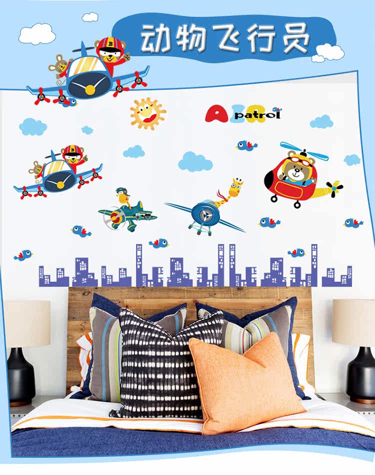 卡通动物飞行员男孩卧室儿童房床头柜门墙壁装饰自粘可移除墙贴纸