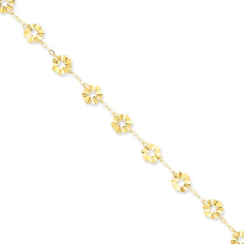 This 9-inch anklet is crafted with 14 karat yellow gold and features 7.5mm flower station charms and 1-inch extender accent with a tiny heart charm. It closes with a spring ring clasp.