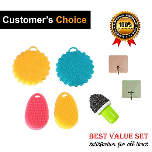 - PERFECT CLEANING: This silicone dish scrubber is soft and flexible to get into glasses or corners of pans with ease. It can rinse clean fairly well and dry throughly, and they can easily be popped in the dishwasher or even boiled to get clean. 2 Clear Silicone with Metal and Plastic Hooks for Bonus.