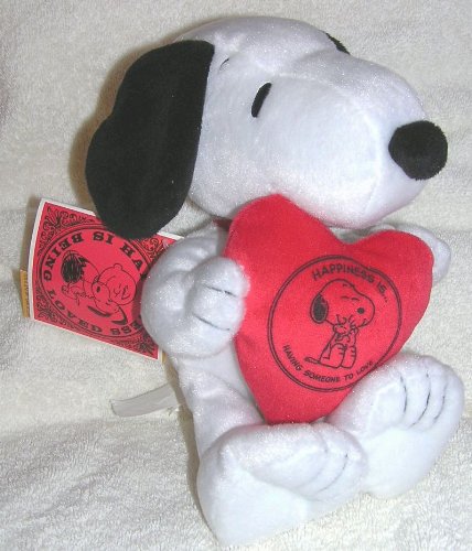 -. Feature : Happiness is Having Someone to Love / Soft plush Snoopy holding Heart / Approx. 9" high from head to toe / Snoopy plush / Red ribbon collar around neck