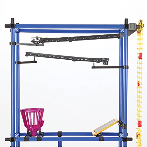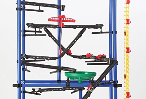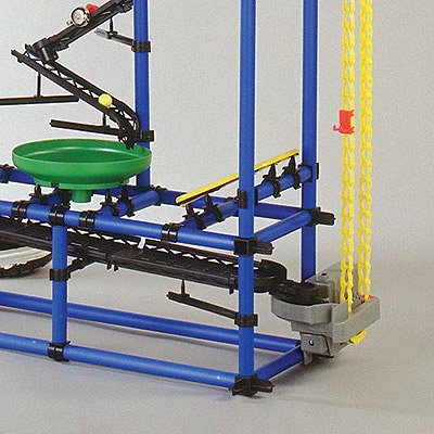 Rube Goldberg Kit It's called chaos, but kids don't need a kit to create that, do they? And it actually is used to create really fun controlled "perpetual motion" Rube Goldberg-type devices. You (your kids will never displace you once they see this kit) assemble a frame of your choice and adorn it with sets of chutes, slides, funnels, catch baskets, trampolines... You name it. The new Chaos motor driven chain lifts a ball to the top of your construction and off it goes through whatever course(s) you have set up. It is really educational physics, and we guarantee hours of creative fun with this top quality, attractively packaged kit. The tower has a max height of 78" and a whopping 602 pieces! It also includes an educational CD ROM. Everything you need (except batteries) is included. Ages 7 & up.Feature