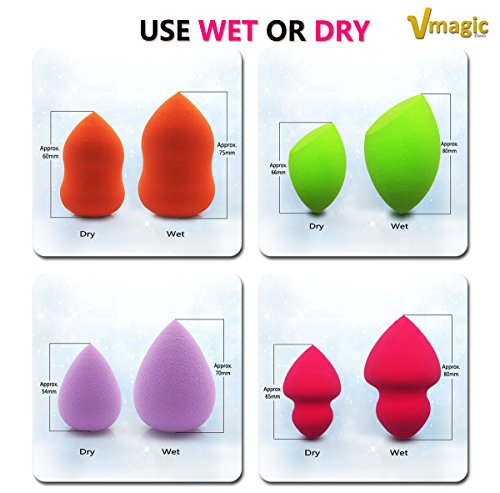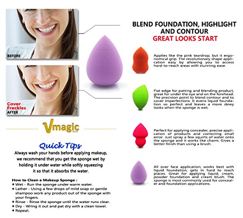 -. Feature : ✔ PRODUCT DESIGN : Four Shapes versatile design enables you to access hard-to-reach spots. It decorates your foundation around eyes, nose, and mouth with point end of the puff. It ensures an even and clear application. / ✔ QUALITY AND MATERIALS : Using of the latest international environmental protection of late free as raw material. / ✔ MAKEUP EFFECT : The flawless airbrushed look, smooth, professional results and get the perfect glow. The precision, pliable texture soaks up your favorite foundation and evenly pushes it into your skin with almost no effort on your part. You don't have to be a professional makeup artist to look amazing. Not with our blending sponge. Just tap it along on your face ever so slightly, lightly blend in your foundation, and let it do its job for amazing results. / ✔ COMPLETE SPONGE SET - Comes with 4 unique multi-functional shaped makeup sponges in a single set. This set is the all in one set for needed all types of makeup application. (1) Teardrop, (1) Gyroscope, (1) Gourd, (1) Flat Edge Olive. / ✔ P.R.ICING : VMAGIC's just want to share the results with our customer, because we are also consumers. Your purchase is fully protected when you order today - if you're not 100% satisfied, we'll give you 100% of your money back, no questions asked. Hence, it ensures more impeccable, streak-free application with least product waste comparing to other brands.