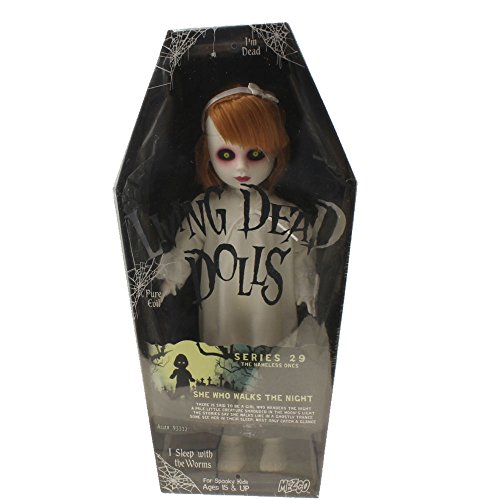 These little horrors just want to spend some nice playtime with you, so don't be scared. They won't bite you or kill you or bury you alive... maybe. Each Living Dead Doll comes with its very own coffin and measures about 10 1/2-inches tall. Come play with them tonight, won't you?Feature