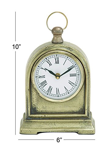 10" modern reflections rustic aluminum mantel clock, tarnished blemished gold-finish aluminum, rounded top upright housing with squared, beveled base, knob finial with loop handle, 1 a battery-operated clock with glass crystal, black roman numerals on white faceplate, black hour and minute hands.Feature