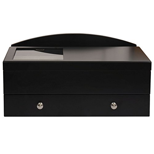 Open the top lid to reveal storage for four watches ,matching watch pillows, and Change is kept easily accessible in the coin scoop.