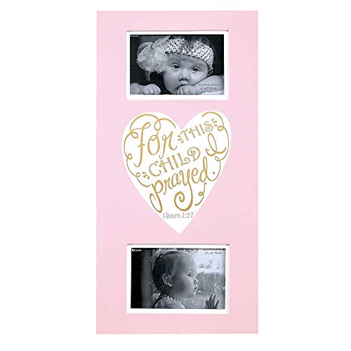 ReleaseDate : 2016-06-20 Studio : Dicksons, Inc. Publisher : Dicksons, Inc. Binding : Baby Product Product Description This decorative pink baby girl wall plaque is also a frame that holds two 4 x 6 photos. Wonderful new baby gift idea. Heart design at center has the words For This Child I Prayed from 1 Sam. 1:27. Overall size of piece is 19 inches high, 9 1/2 inches wide and 1 1/8 inches deep. Made of MDF, a wood material with smooth surface. 0