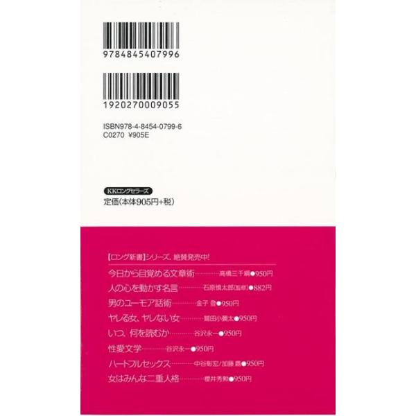 【商品基本情報】 商品名称:女がその気になる話術-ロング新書 著者/出版社:櫻井 秀勲/櫻井 秀勲 初版発行日:2007/12/25 サイズ:新書判 ページ数:222 ISBN/JAN:9784845407996/4528189445406
