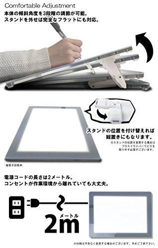 Large Adjustable Work Surface The large 20.18inch surface provides more than enough space so there is no need to move graphics around to trace. The light pad is designed to be used in both vertical/horizontal directions and an optimal drawing angle is provided for each individual by adjusting the foldable legs (3 angles) or lay flat. Features incorporated contribute in preventing physical strain after long hours of usage.