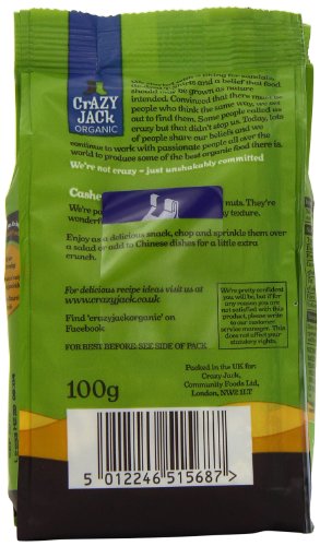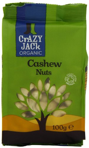 -. Binding : Grocery -. Brand : Crazy Jack -. Feature : Crisp to the bite and particularly creamy / More than half of all cashews are eaten as a snack either by themselves or in a nut mix / Small cashews and broken pieces can be sP.R.Inkled on salads, and used for baking or desserts, and are also commonly added to Indian and Chinese dishes / Organic farming helps reduce the use of oil based fertilisers, encourages biodiversity and helps reduce the use of artificial pesticides / Every time you choose organic you make a difference -. IsAdultProduct : 0 -. Label : CRAZY JACK -. Manufacturer : CRAZY JACK -. MPN : 514513 -. PackageQuantity : 10 -. PartNumber : 514513 -. ProductGroup : Grocery -. ProductTypeName : GROCERY -. Publisher : CRAZY JACK -. Studio : CRAZY JACK -. Title : Crazy Jack Organic Whole Cashew Nuts 100 g (Pack of 10)