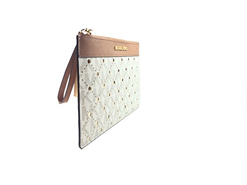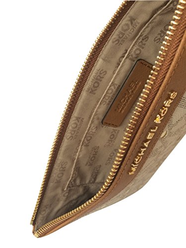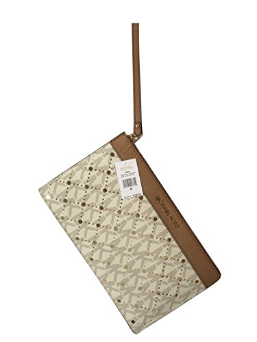 -. Brand : -. Color : Vanilla -. Department : womens -. Feature : laser cut Signature P.R.Inted PCV on the front over a pale gold underlining / Crosshatch finished PVC back, along with polished golden tone hardware / Zippered top closure with (6) inner card slips and an open slip pocket / logo on the front and a wristlet strap with a 5" drop / Measures approximately 10.5" (L) x 6" (H) with an MSRP of $148.00 -. Model : 35T7GV1W3B -. ProductGroup : Shoes -. ProductTypeName : HANDBAG -. Title : Violet Signature Jet Set Travel Large Perforated Zip Clutch and Wristlet