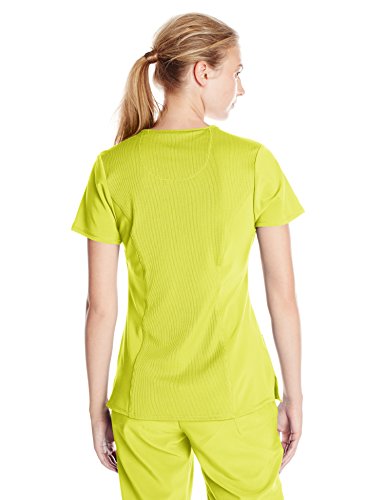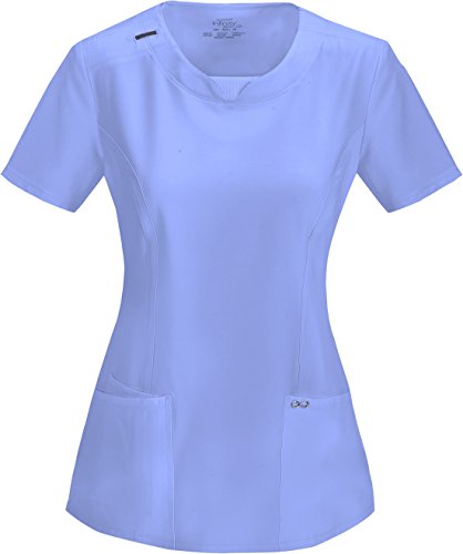 -. Feature : Round neck top with rib inset front neckband / Certainty antimicrobial fabric protection technology / Bungee ID badge loop, two patch pockets, one interior pocket, and side vents / Stretch rib knit at the center back panel gives this top its slimming shape