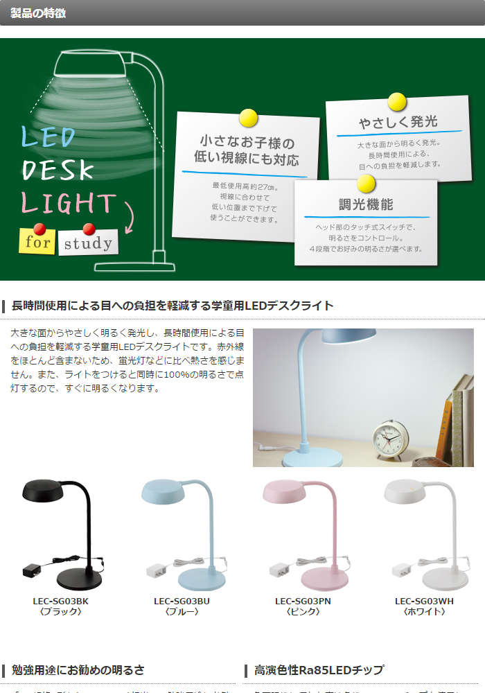 ●大きな面からやさしく明るく発光し、長時間使用による目への負担を軽減する学童用LEDデスクライトです。