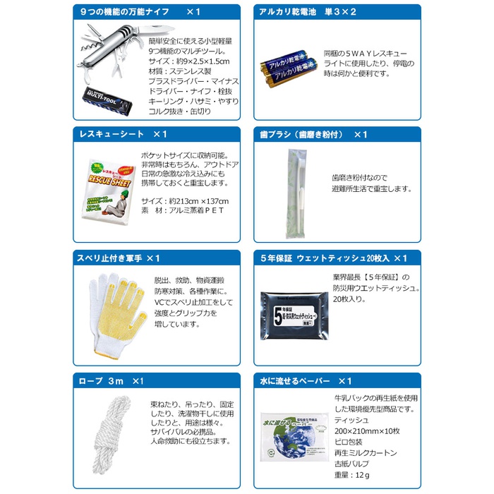세트 내용 수량 피라미드 백 15WAY구출 라이트 110년 보존 수【500ml】 1 프리즈드라이(freezed dry) 비스켓 1구급 세트(aid 크루) 1 긴급 간이 화장실1회용 남녀 겸용 1 휴대용 미니 화장실 1 구출 씨트 1 제균Wet 티슈 1수에 흘려 보내는 페이퍼 1 한 번 쓰고 버려 붙이는 카이로 1방위 자석&whistle부 화타돌 1케이스 첨부이전 1아이마스《구》 1 로프 1 알카리 건전지단3 2만능 나이프 1칫솔 세트 「일본제」 1목장갑(《스베리》지 첨부(부)) 1