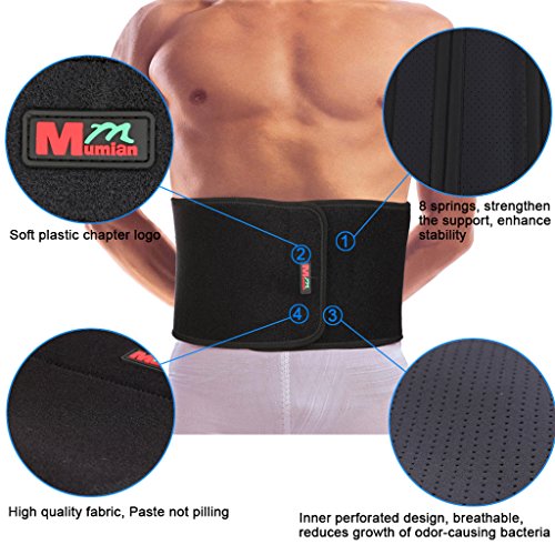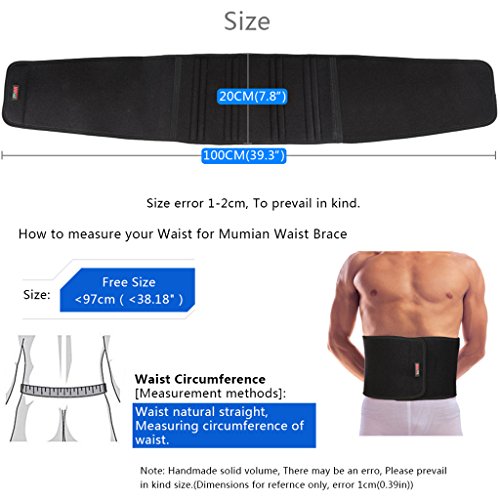Features: 1.Open design, adjustable 2.8 spring, giving strong support to your waist 3.With effective treatment for low back pain, lumbar disc herniation, lumbar muscle strain and the cold stomach 4. Will accelerate weight loss and will create a portable sauna around your waist, by increasing circulation in abdominal area and by stimulating toxins loss during fitness activity, for burning more calories Applicable: Abdominal muscle weakness, lumbago, back muscle strain Specifications: Brand: Mumian Model: H01 Color: Black Material: 65% Neoprene 30% Polyester 5% nylon Size: Free Size, 19.5cm Wide/100cm Long, Suitable for waist circumference less than 97cm Quantity: 1 Pc Note: Please allow 1-3mm error due to manual measurement. pls make sure you do not mind before you bid Due to the difference between different monitors, the picture may not reflect the actual color of the item. Thank you! Package includes: 1 Pc x Waist Protector 0