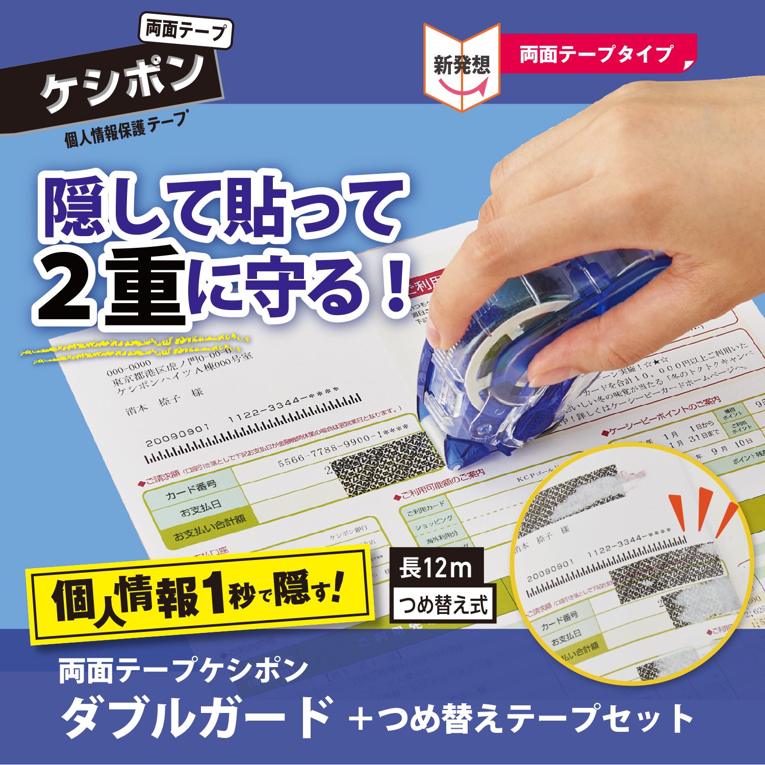 強力な両面テープとケシポン柄で隠して貼って、ダブルガードでしっかり個人情報保護 セット内容 : 両面テープケシポン 本体 1個 + つめ替え用テープ 1個 規格 : 両面テープケシポン / テープ仕様 : 超強力にはるタイプ+ケシポン柄 本体外形寸法 : W91×D26×H53mm / テープ : 幅=15mm、長さ=12m / 使用回数 : 約200回(1個当たり) タイプ : テープ交換式 (つめ替え式) / 材質 : ABS