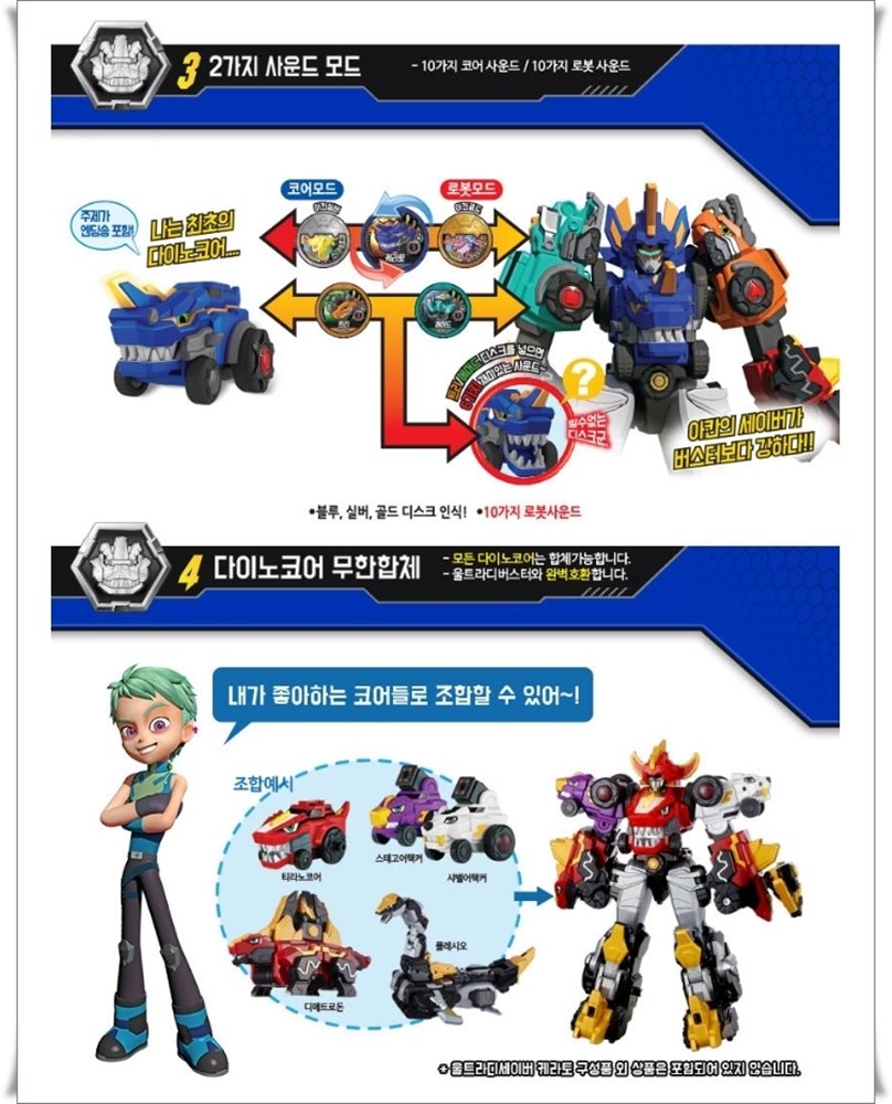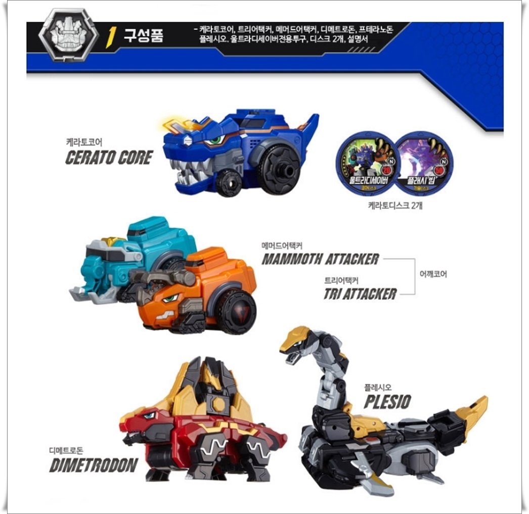Enjoyment of 3 types of robot transformation Age of use : Over 37 months Material : ABS etc. Components : Cerato Core, Tri Attacker, Mammoth Attacker, Dimetrodon, Plesio, 2 discs Country of manufacture : China (Designed in Korea) Batteries : Needs 2 of AAA types (not included) Package Size : W400 x D100 x H500 |