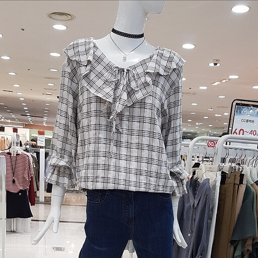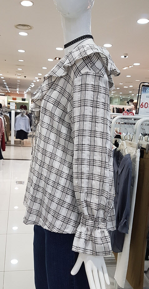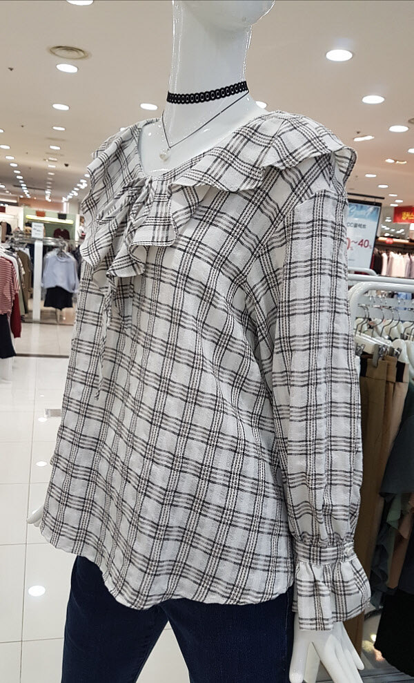 아이보리컬러에 체크패턴이 세련하죵깊게파인 V넥목선에 제상체가 날씬해요어깨선부터 떨어지는 러플은 여성스럽구요여유있는 사이즈와 면소재로 착용감좋아용체크패턴에 구김이 가려지네요^^