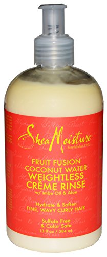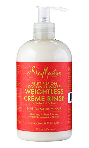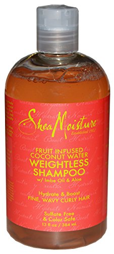 Studio : Shea Moisture Publisher : Shea Moisture Binding : Misc. Product Description Shea Moisture Fruit Infused Coconut Water Weightless Shampoo and Creme Rinse. Contains 1 (13 Fluid Ounce) Weightless Shampoo and 1 (13 Fluid Ounce) Weightless Creme Rinse. Hydrate, Boost, and Soften Fine, Wavy and Curly Hair. Sulfate Free, Color Safe, Cruelty Free, Paraben Free, No Phthalates, No Propylene Glycol, No Mineral Oil. Certified Organic Shea Butter and Coconut Water blend with Dragon Fruit, Lychee Berry, and Green Apple Extracts. 0