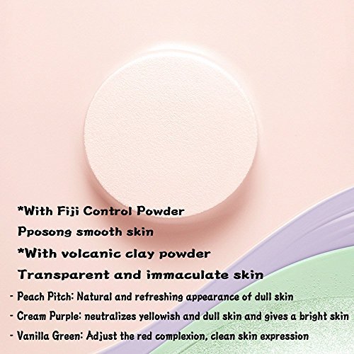 Color ..... #01.Peach Pitch, #02.Cream Purple, #03.Vanilla Green - Peach Pitch: Natural and refreshing appearance of dull skin - Cream Purple: neutralizes yellowish and dull skin and gives a bright skin - Vanilla Green: Adjust the red complexion, clean skin expression 1.With volcanic clay powder Transparent and immaculate skin 2.With Fiji Control Powder Pposong smooth skin How to use After taking the appropriate amount into the puff, apply a thin layer on the face during the foundation stage and finish by tapping lightly