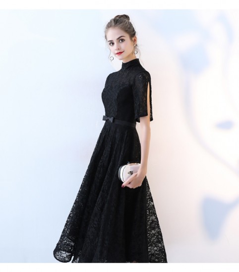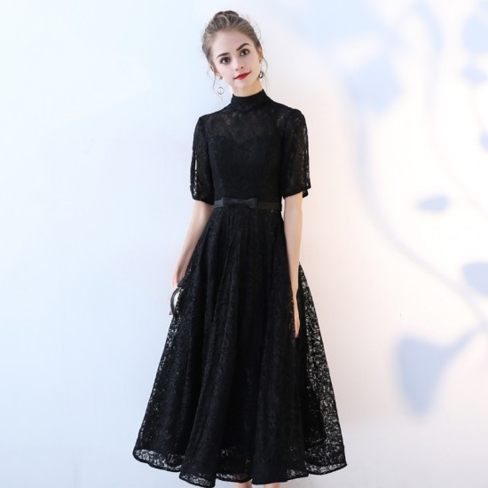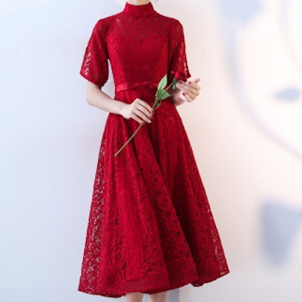 ワンピース ロング丈 レディース パーティードレス ハイネック 花柄レース リボンベルト 半袖 ブラック レッド エレガント 可愛い お呼ばれ デート drgz0753