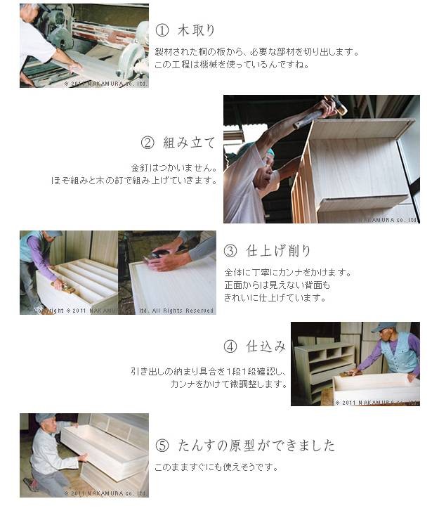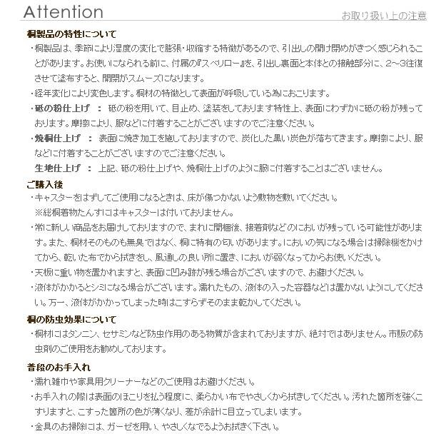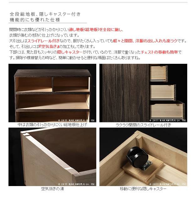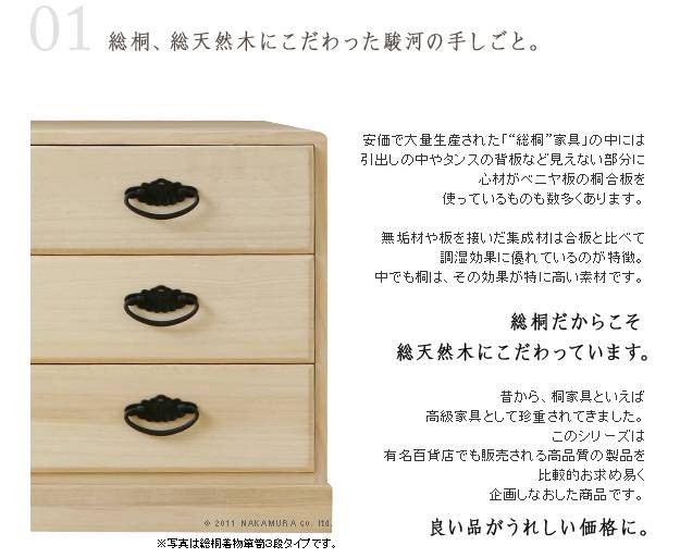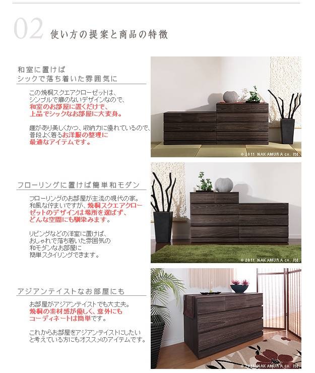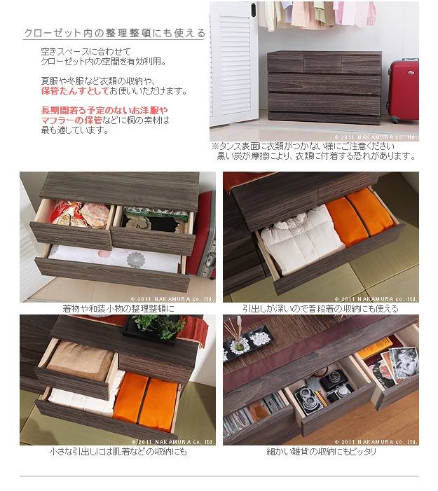 商品について:衣類の収納に最適な桐箪笥。国産でこのお値段はお得!趣きある焼桐仕上げ+スクエアの形状で和家具が和モダンテイストに。大引出しは出し入れのスムーズなコロレール付。隠しキャスターが付いているのでクローゼット内の移動に便利♪キャスターをはずしてリビング使いでもOKです☆