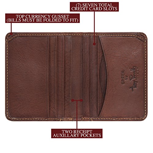 PRODUCT FEATURES: -Single Currency Divider Gusset -Seven credit card slots, two receipt slots -Dimensions: 3"(L) x 4"(H) x 0.5"(W). Weight: 0.45lbs