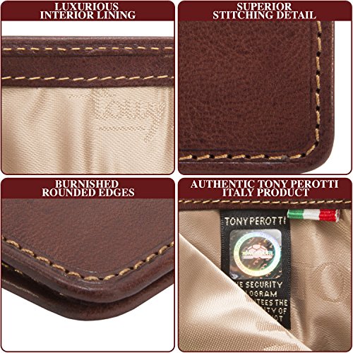 Since 1970 Tony Perotti has been constantly introducing styles that set future trends while maintaining a firm footing in the noblest Italian traditions of leather craft. All of our Tony Perotti products are made from carefully selected genuine Italian full grain hides, tanned in the most recognized expertise and leather craftsmanship based on ancient and noble Italian artisanship. The cool Italian weather prevents any flea or tick irritation to the animals, attributing to the top quality and purity of the leather without any scratches or bites. The tanning process utilizes an eco-friendly approach by using vegetable extracts without the use of toxic or polluting substances. This vegetable tanning process allows the leather to retain its natural look and feel, as well as beautifying and maturing over time to develop a pleasant patina that gives the wallet an antique look as it gets older. It also allows the leather to be easily manageable and maintained, as the vegetable oils and dye can cover any scratches or marks on the leather by rubbing it off with a fine cloth or leather cleaning lotion. We are certain that you will love and appreciate our products. Thank you for being part of this tradition!