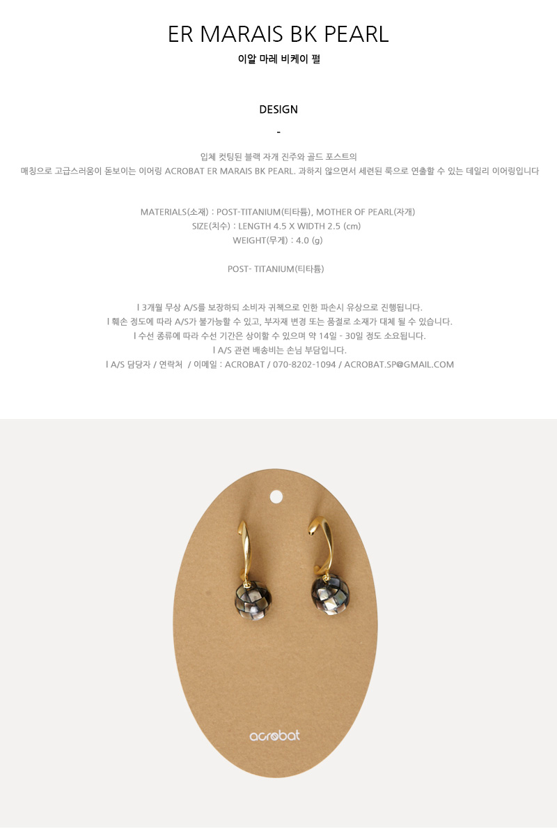 ER MARAIS BK PEARL l 입체 컷팅된 블랙 자개 진주와 골드 포스트의 매칭으로 고급스러움이 돋보이는 이어링 ACROBAT ER MARAIS BK PEARL. 과하지 않으면서 세련된 룩으로 연출할 수 있는 데일리 이어링입니다.