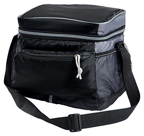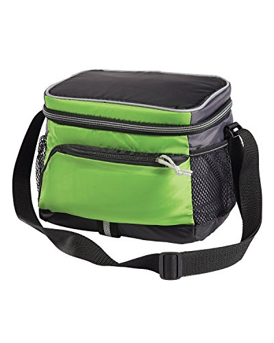 -. Feature : 210-denier polyester; 8"w x 8 1/2"h x 10"L / PVC-free; PEVA lining and PU fabric backing / 14-can capacity; / front zippered and mesh side pockets; adjustable shoulder strap / heat-sealed interior