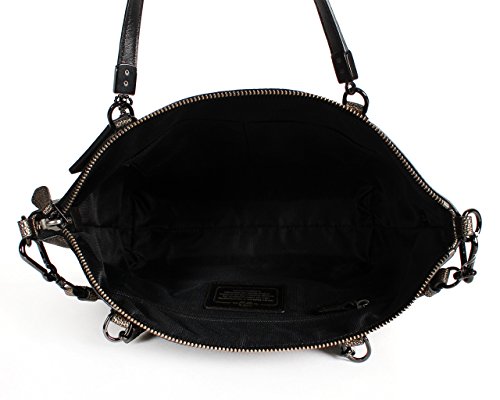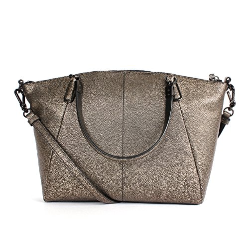 -. Feature : Dark hardware, metallic leather / Zip-top closure, fabric lining / Handles with 5" drop, removable and adjustable strap with 21'' drop for shoulder wear / Inside 1 zip pocket, 1 cell phone pocket and 1 multifunction pocket / Measures approximately: 13 1/2" (L) x 8 3/4 "(H) x 3 3/4" (D)