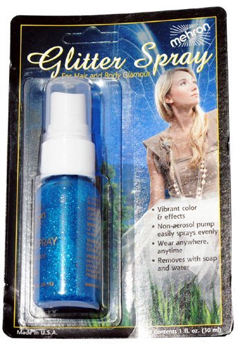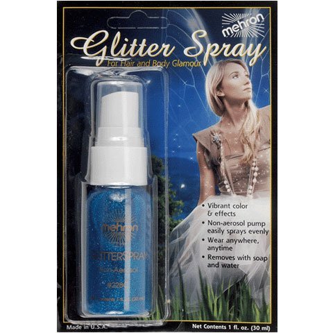 Studio : Mehron Publisher : Mehron Binding : Misc. Product Description Create an eye popping look with our Blue Glitter Spray! Spray on hair, clothing, or even balloons! Easily comes off with soap and water! Holds 1 ounce of spray. Includes 1 bottle per package. 0