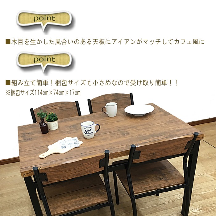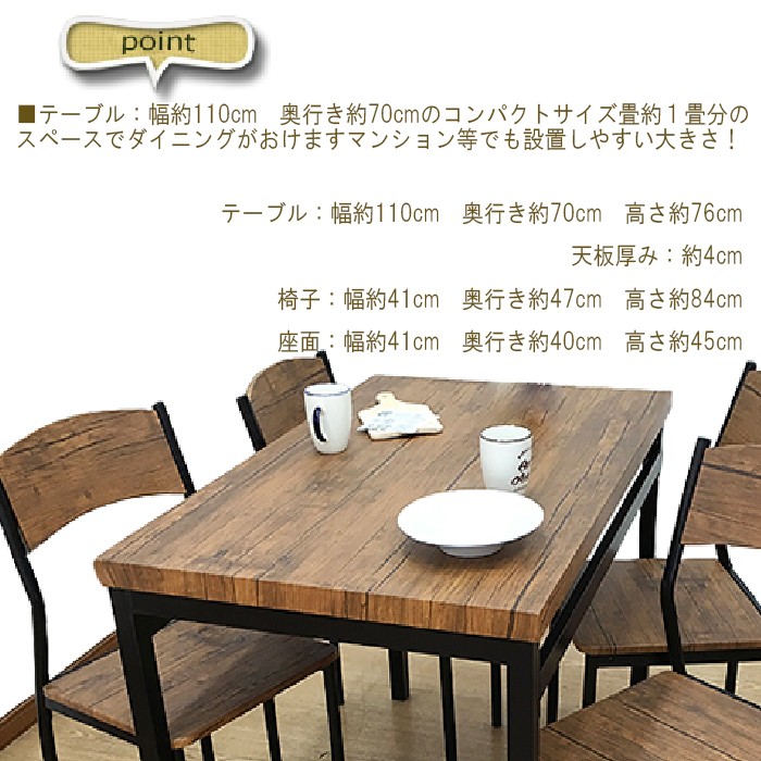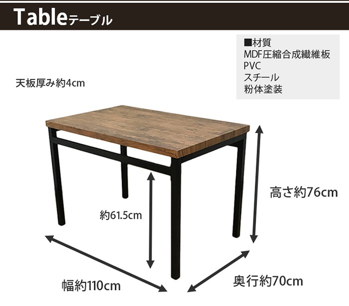 | サイズ | テーブル:幅約110cm 奥行き約70cm 高さ約76cm 天板厚み:約4cm 椅子:幅約41cm 奥行き約47cm 高さ約84cm 座面:幅約41cm 奥行き約40cm 高さ約45cm ※多少の誤差はご了承ください。 |