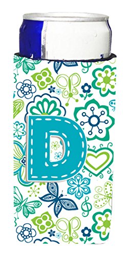 Letter D Flowers and Butterflies Teal Blue Ultra Beverage Insulators for slim cans CJ2006-DMUK
