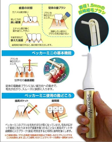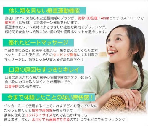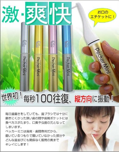 "Pecker Mini Silver (with 10 replacement brushes)" is a handy-sized fashionable aluminum body that makes it easy to carry an electric interdental brush.