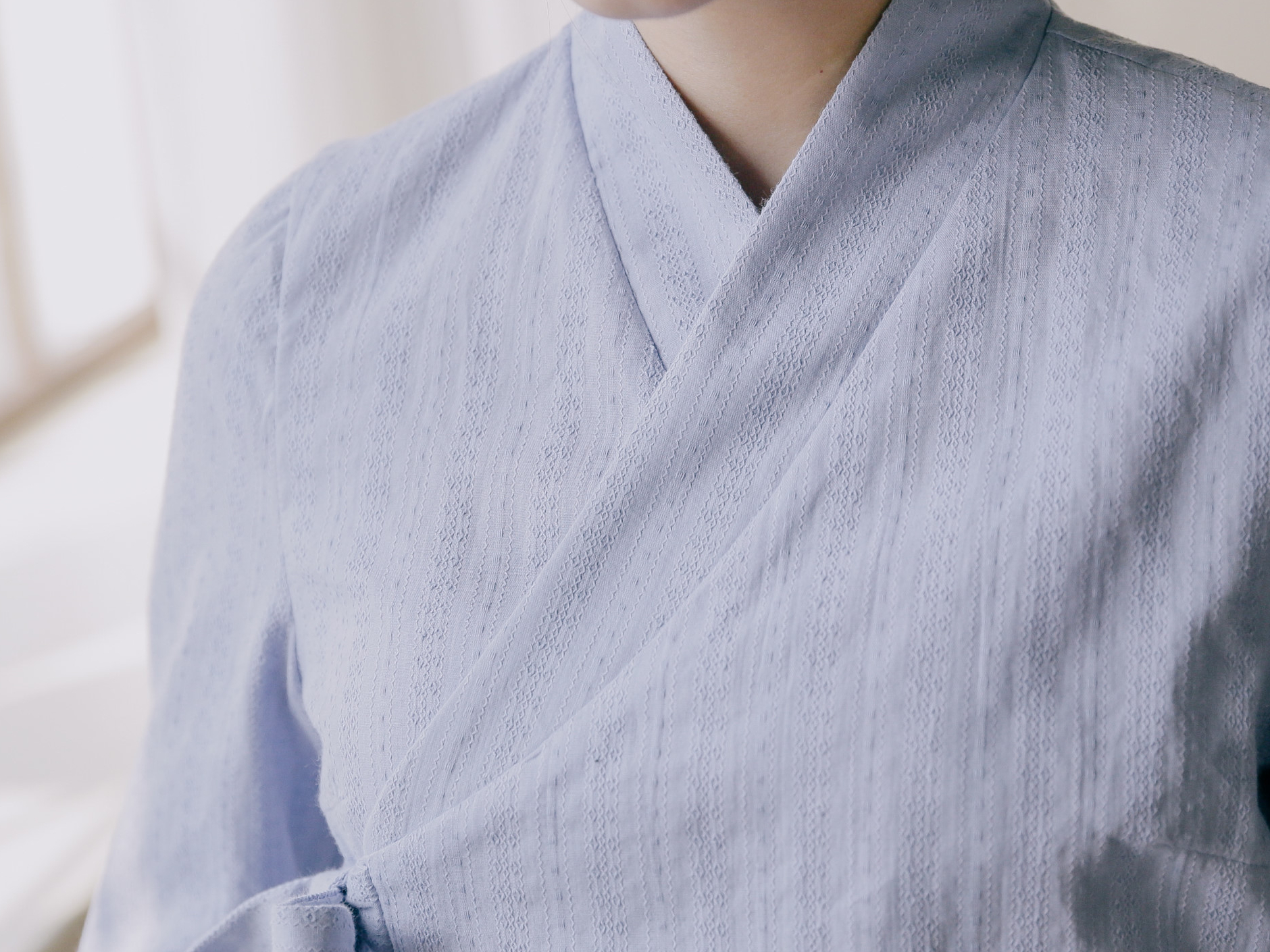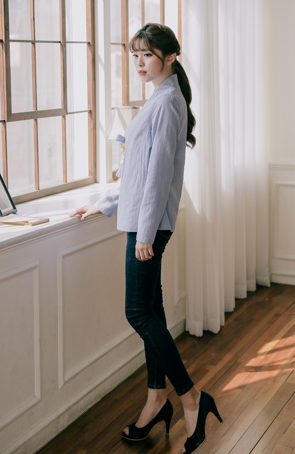 세로 쟈가드문양이 새겨져 있어 체형이 슬림해 보이고, 쟈가드 원단이 주는 톡톡함과 컬러가 주는 단아함은 어느 하의에나 잘 어울려 활용도가 아주 좋은 블라우스 저고리에요.